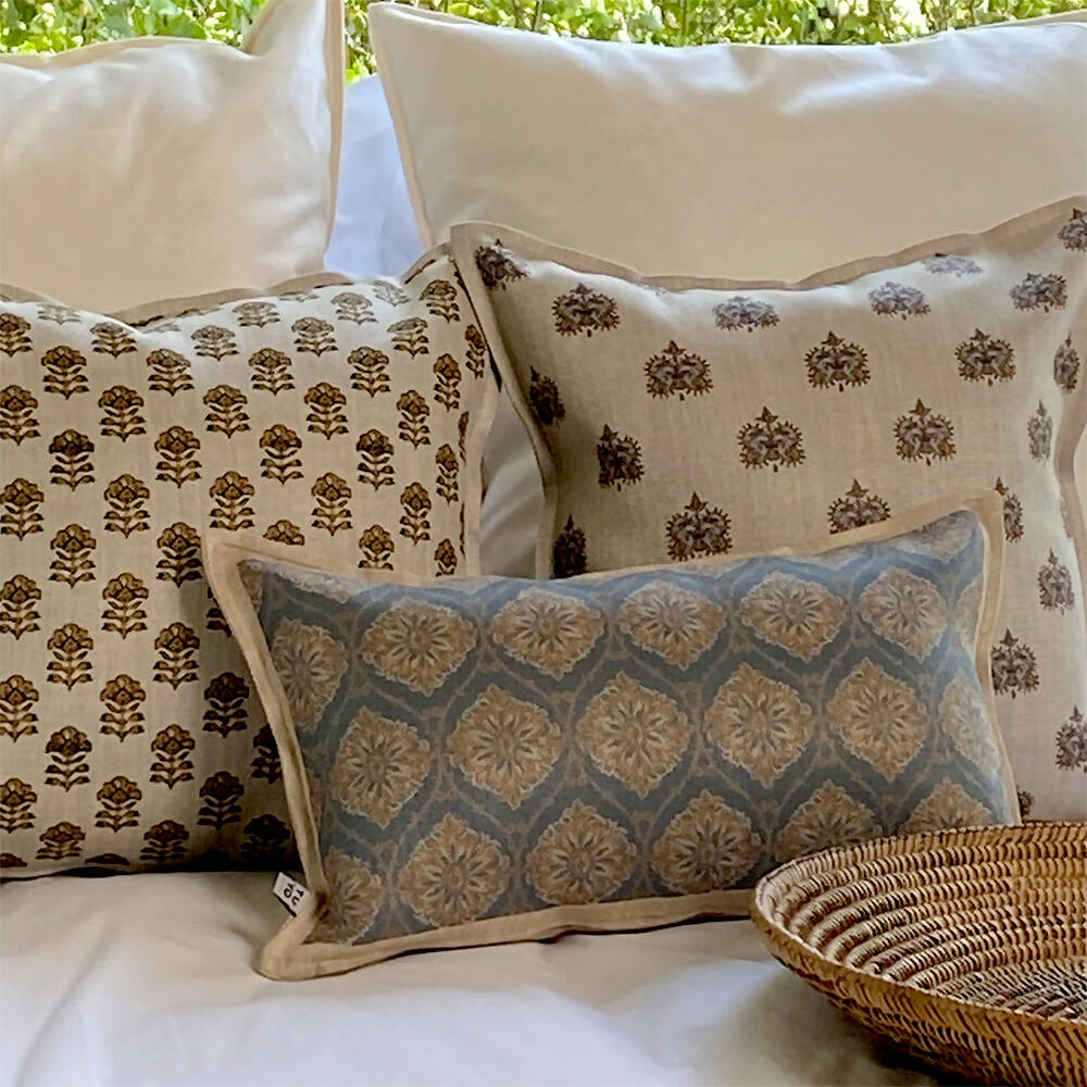 Cojín Paraiso 3 en linet arena estampado 45 x 45 cm.