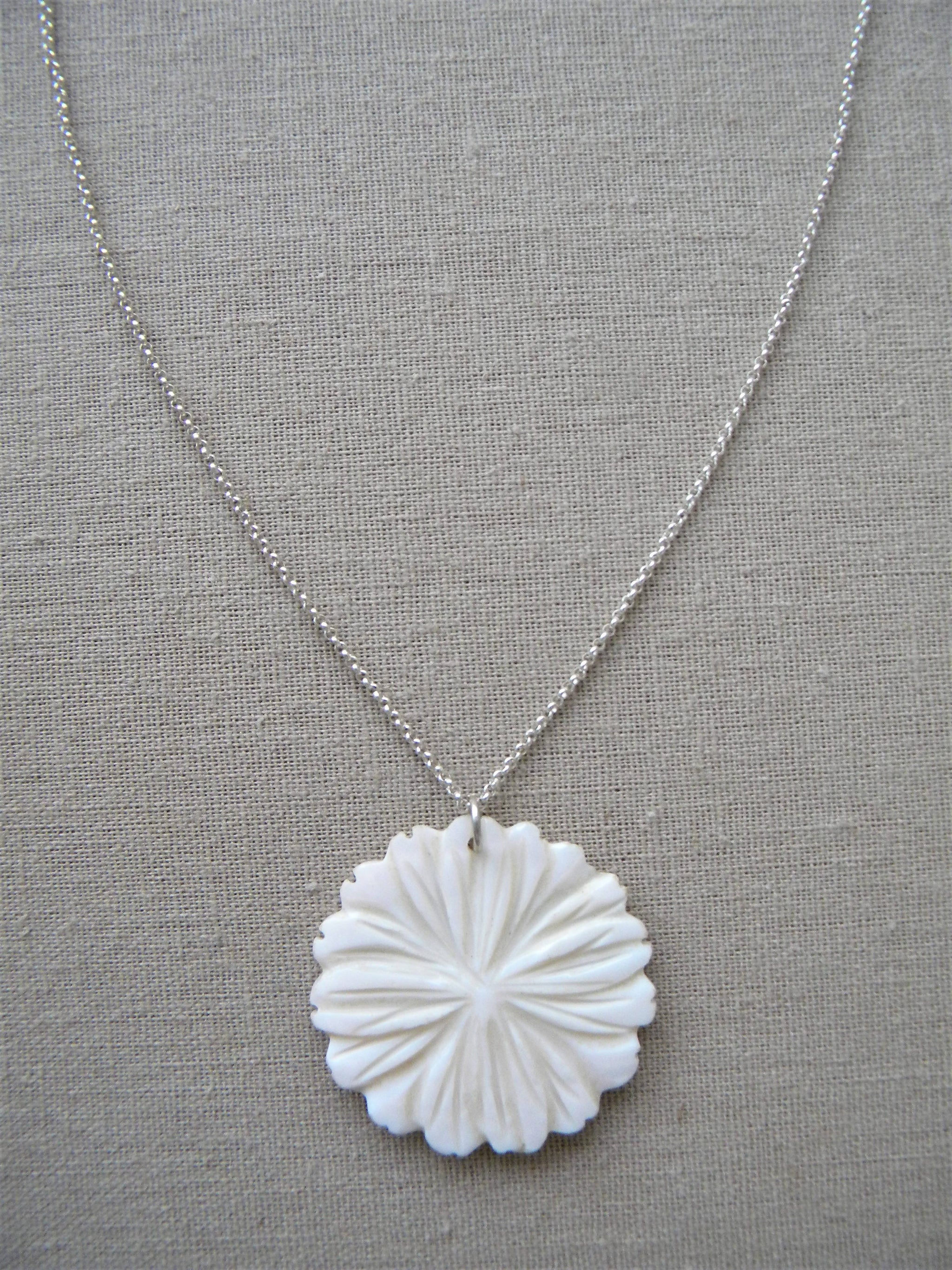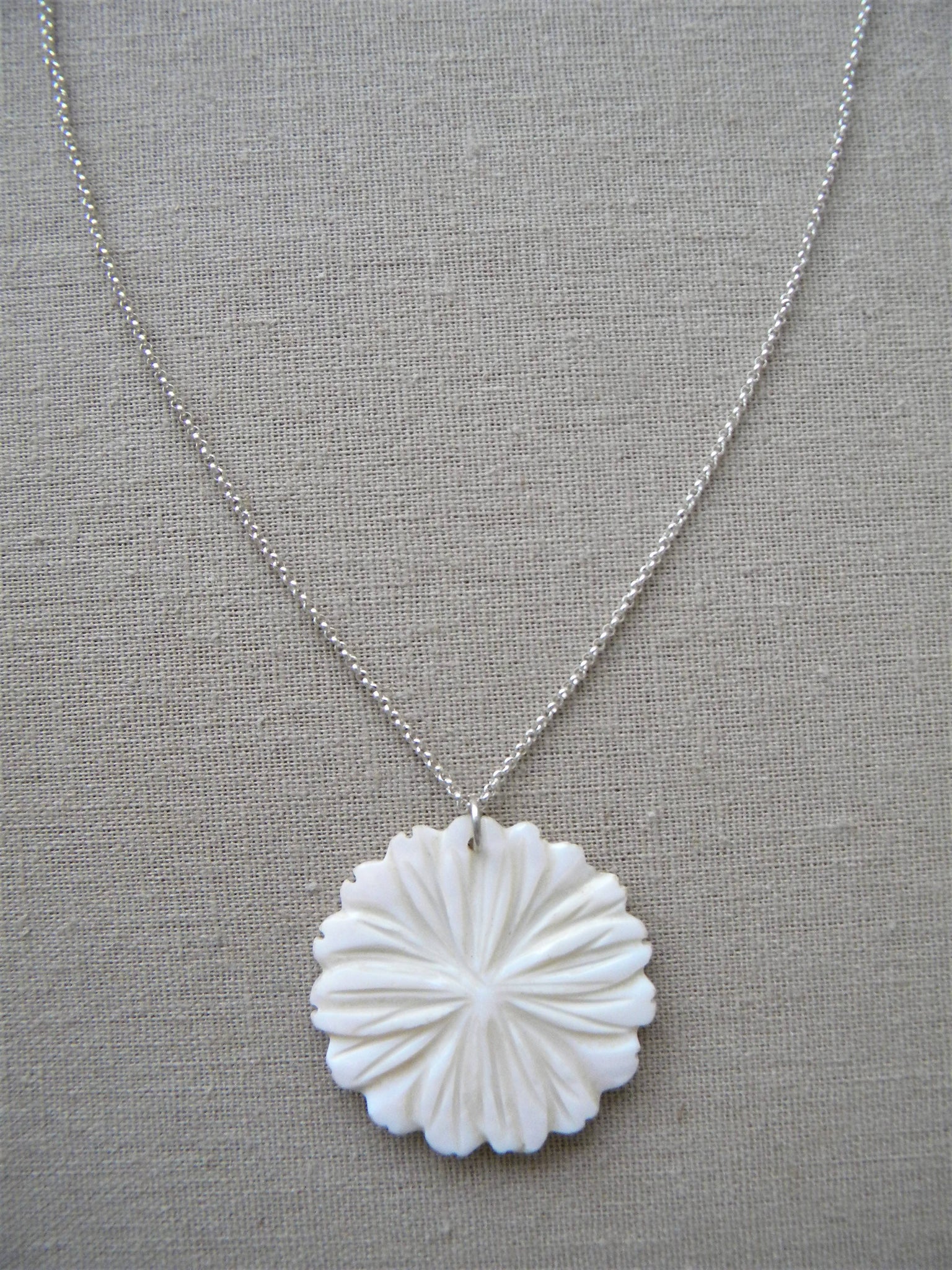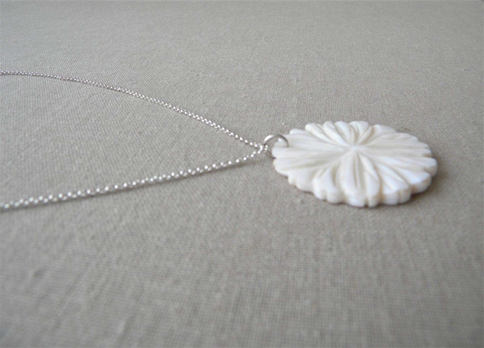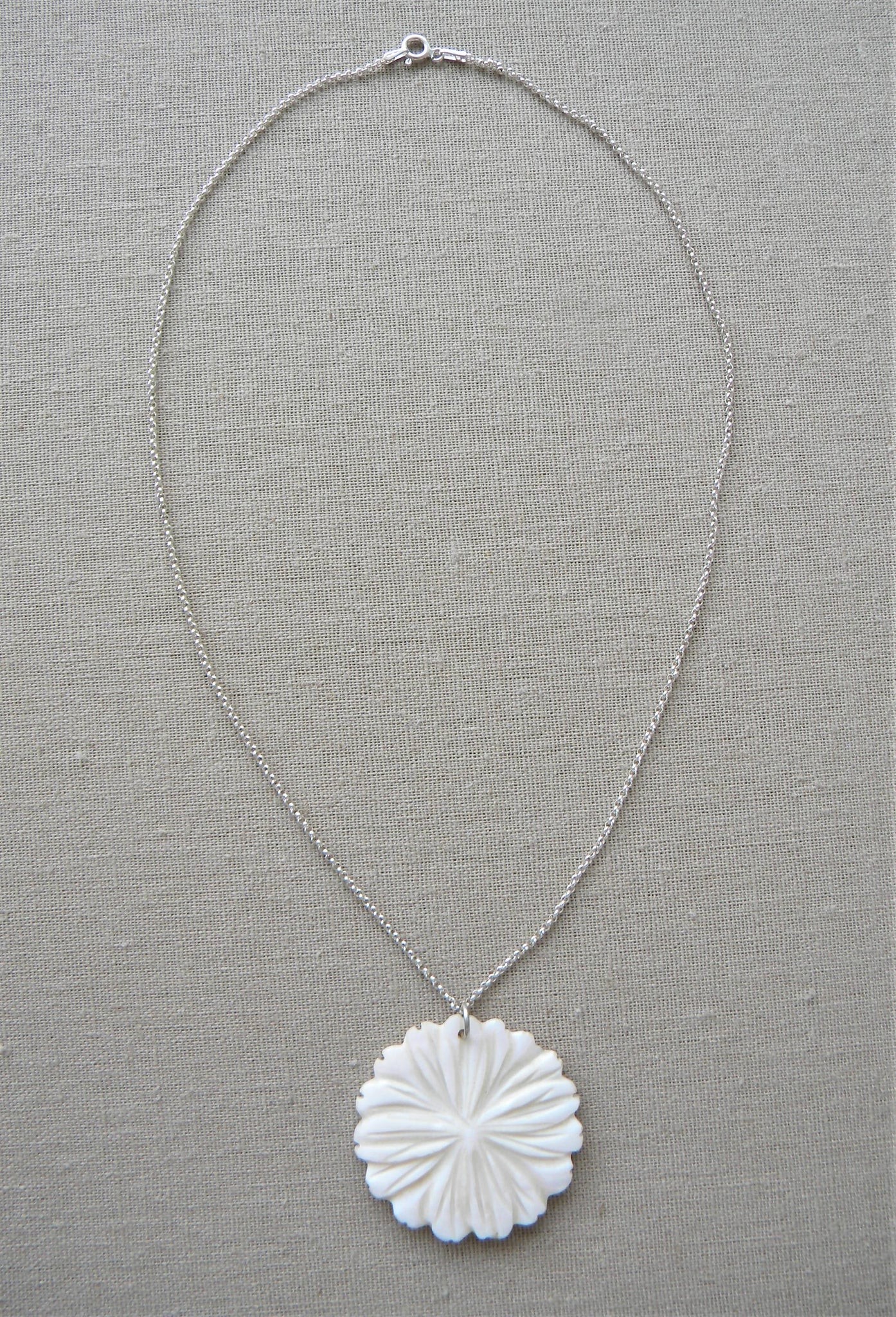 Es un collar corto hecho con una cadena en plata 950 y un colgante de flor multipétalo en nácar blanco que mide 4cm de diámetro.