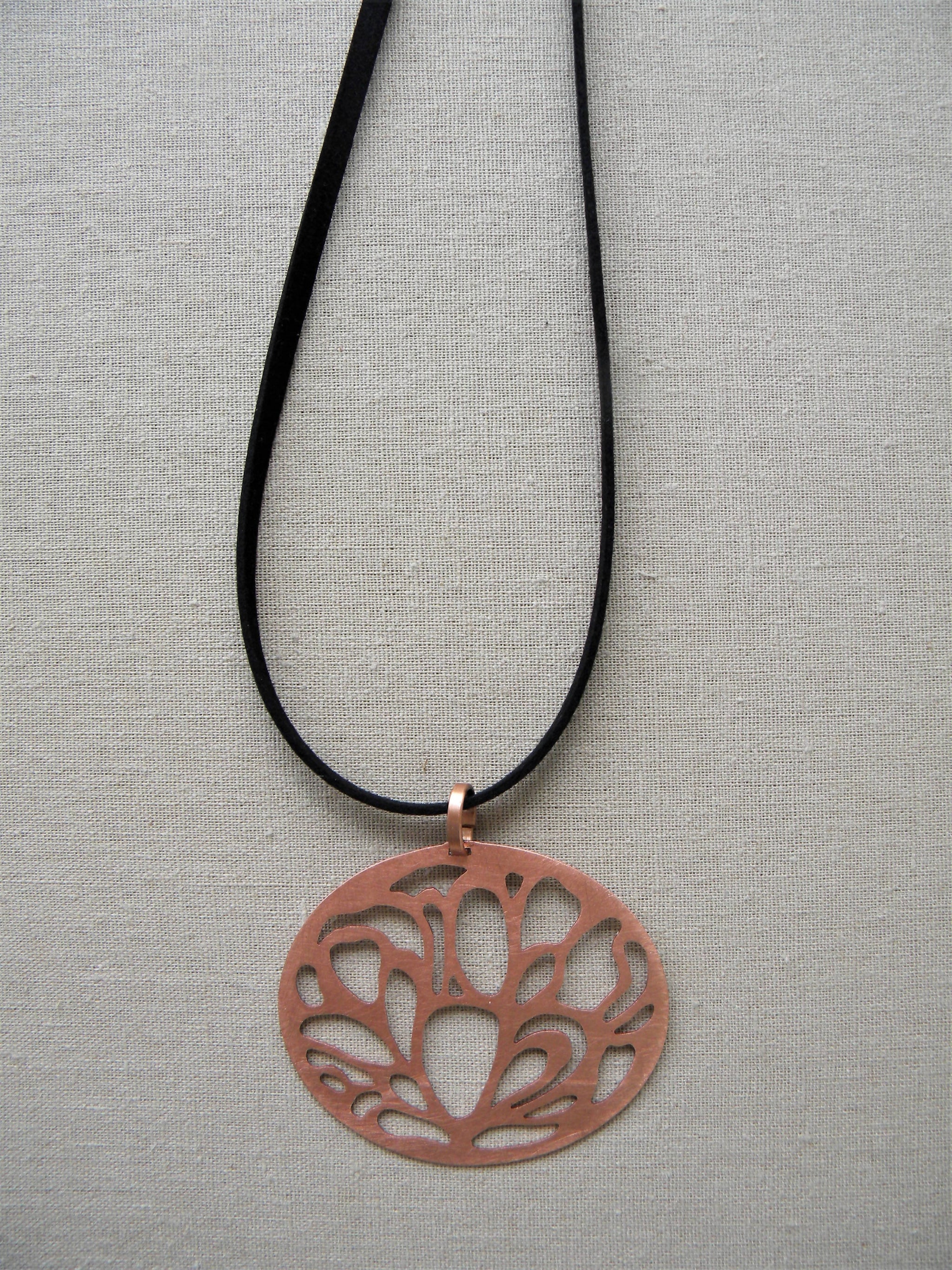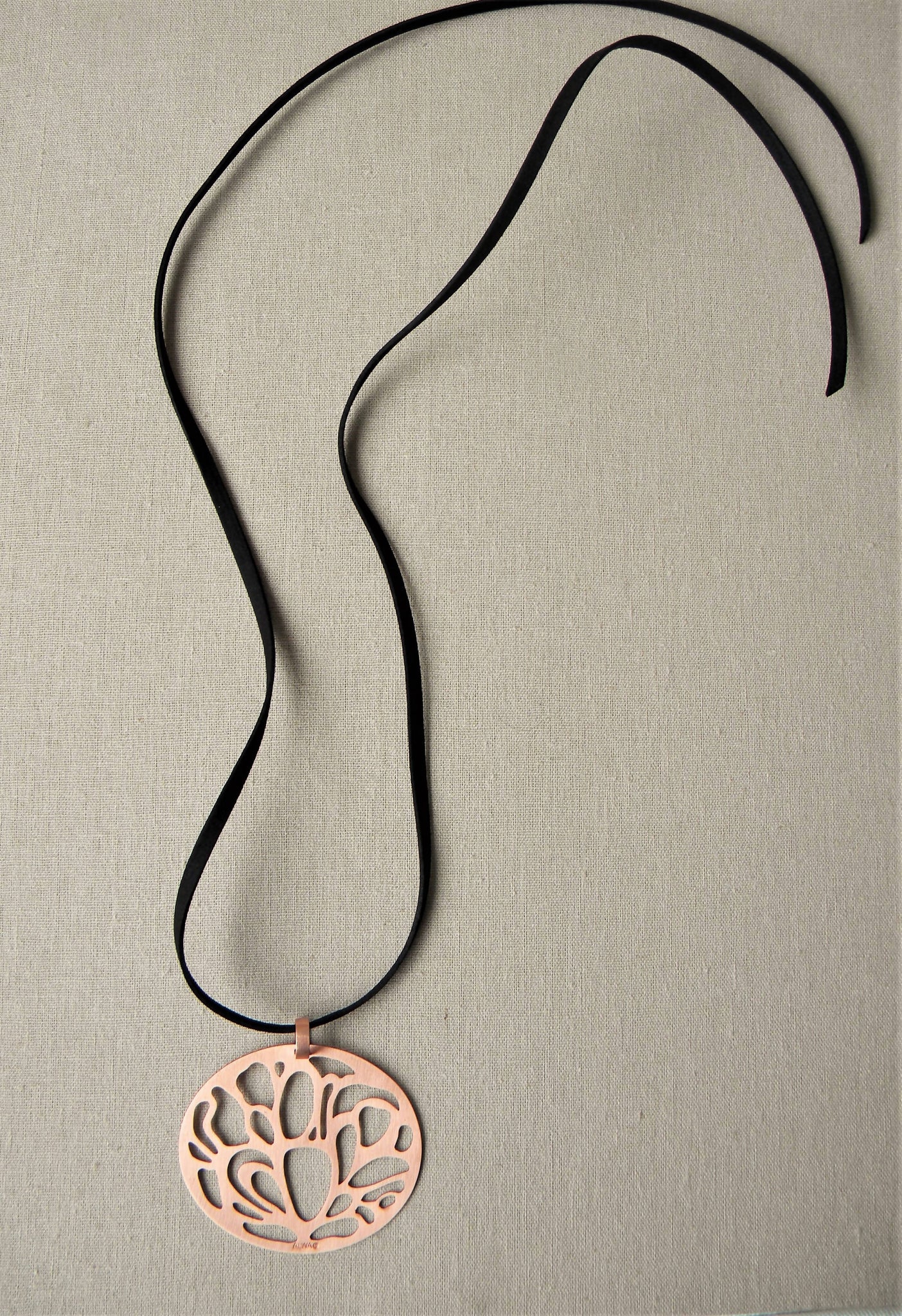 Este collar está hecho en cobre y calado a mano con un diseño ovalado original de ALWA.