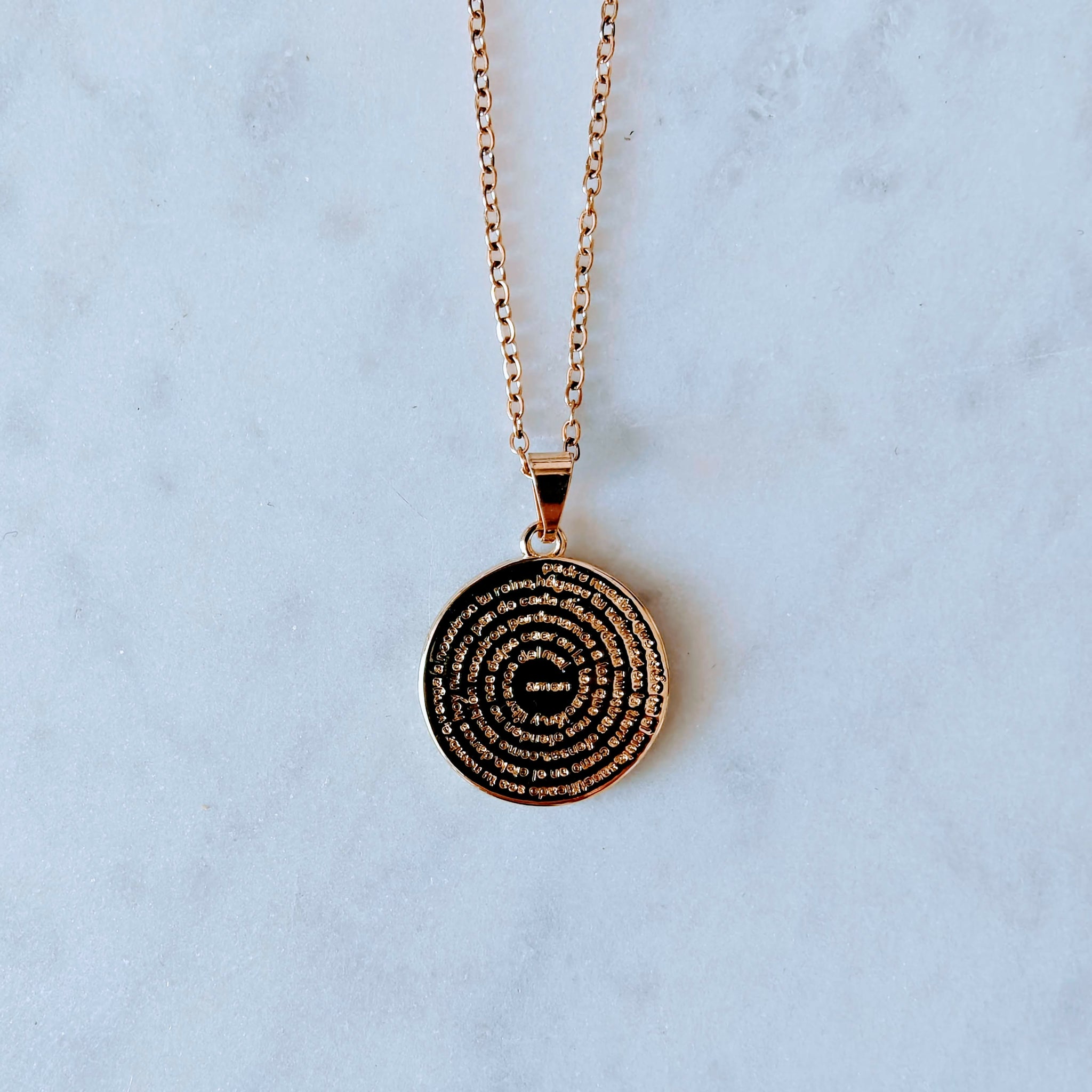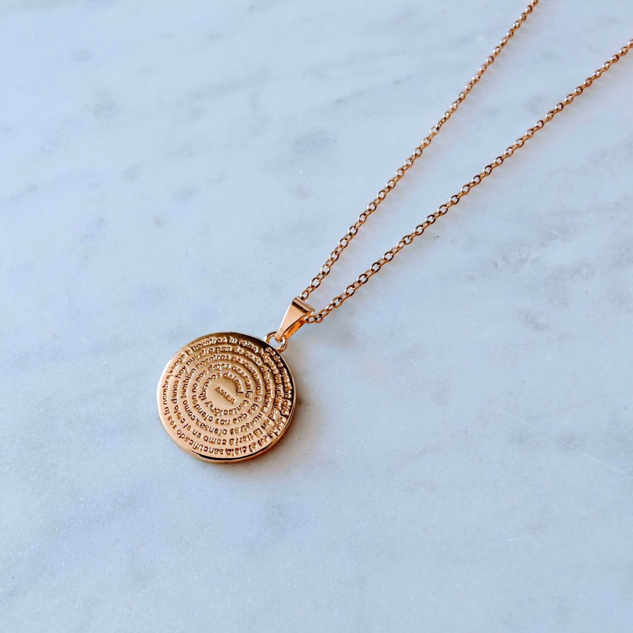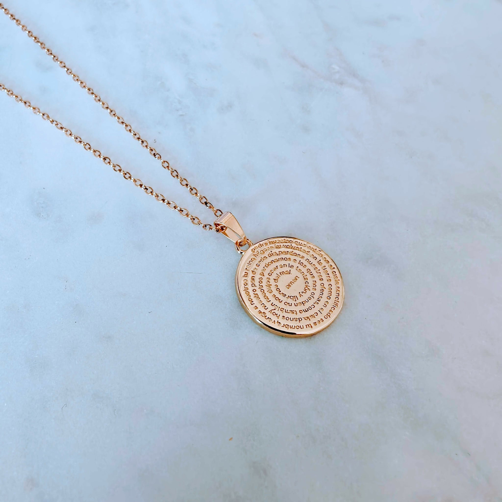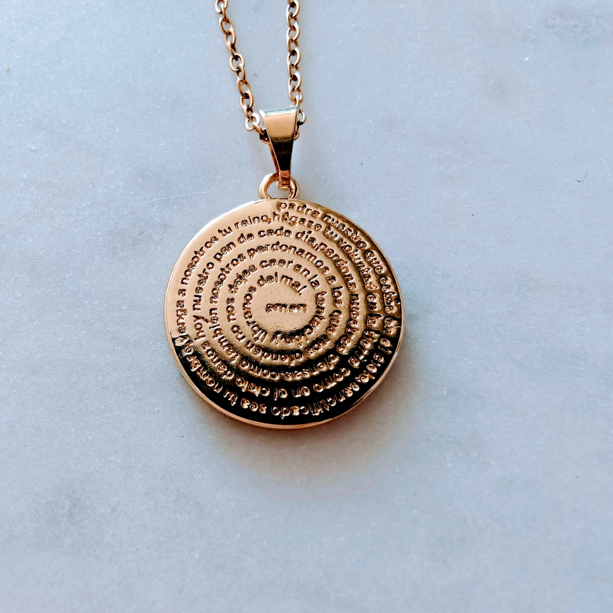 Collar de medalla con la bendición del Padre Nuestro bajo relieve, bañado en oro.