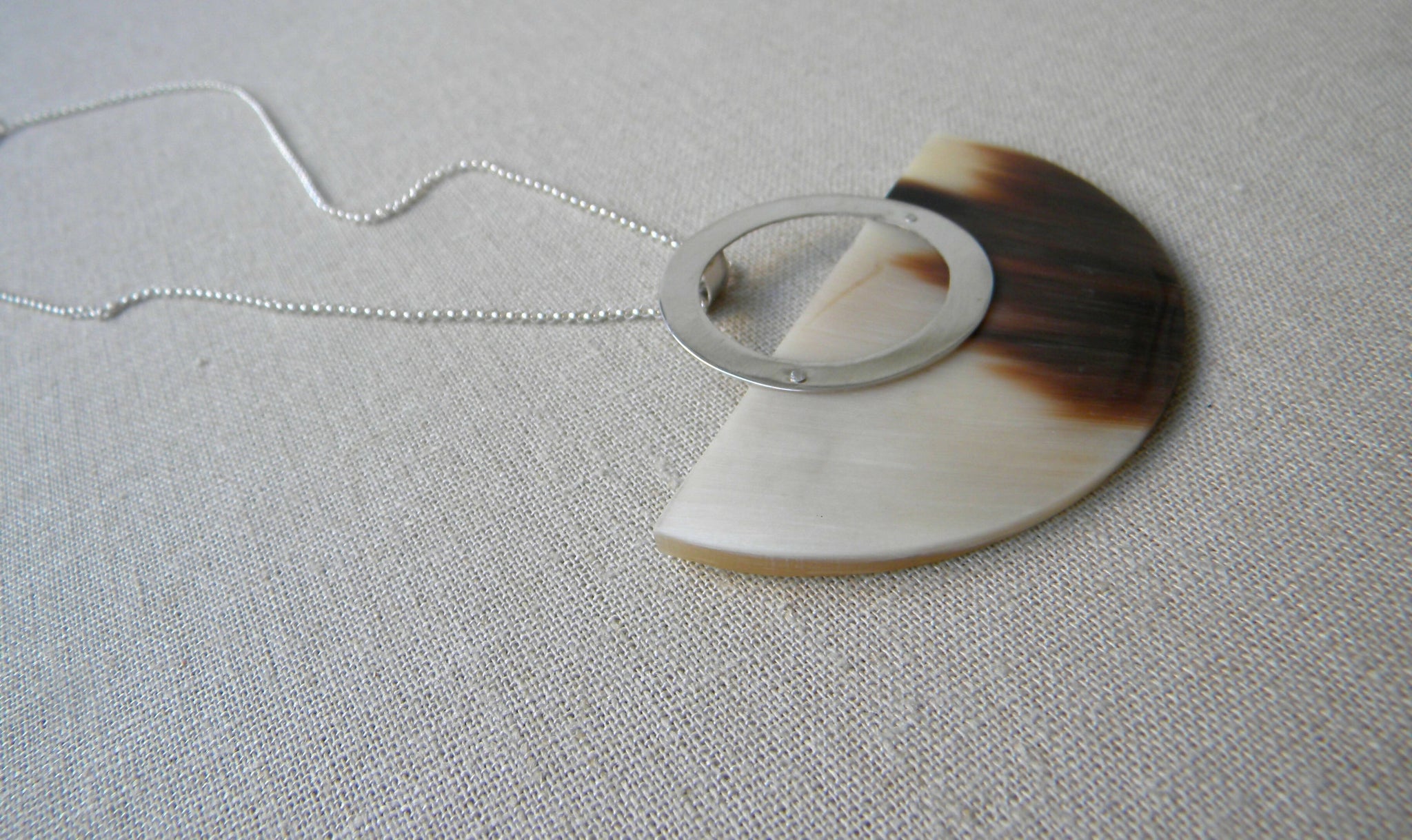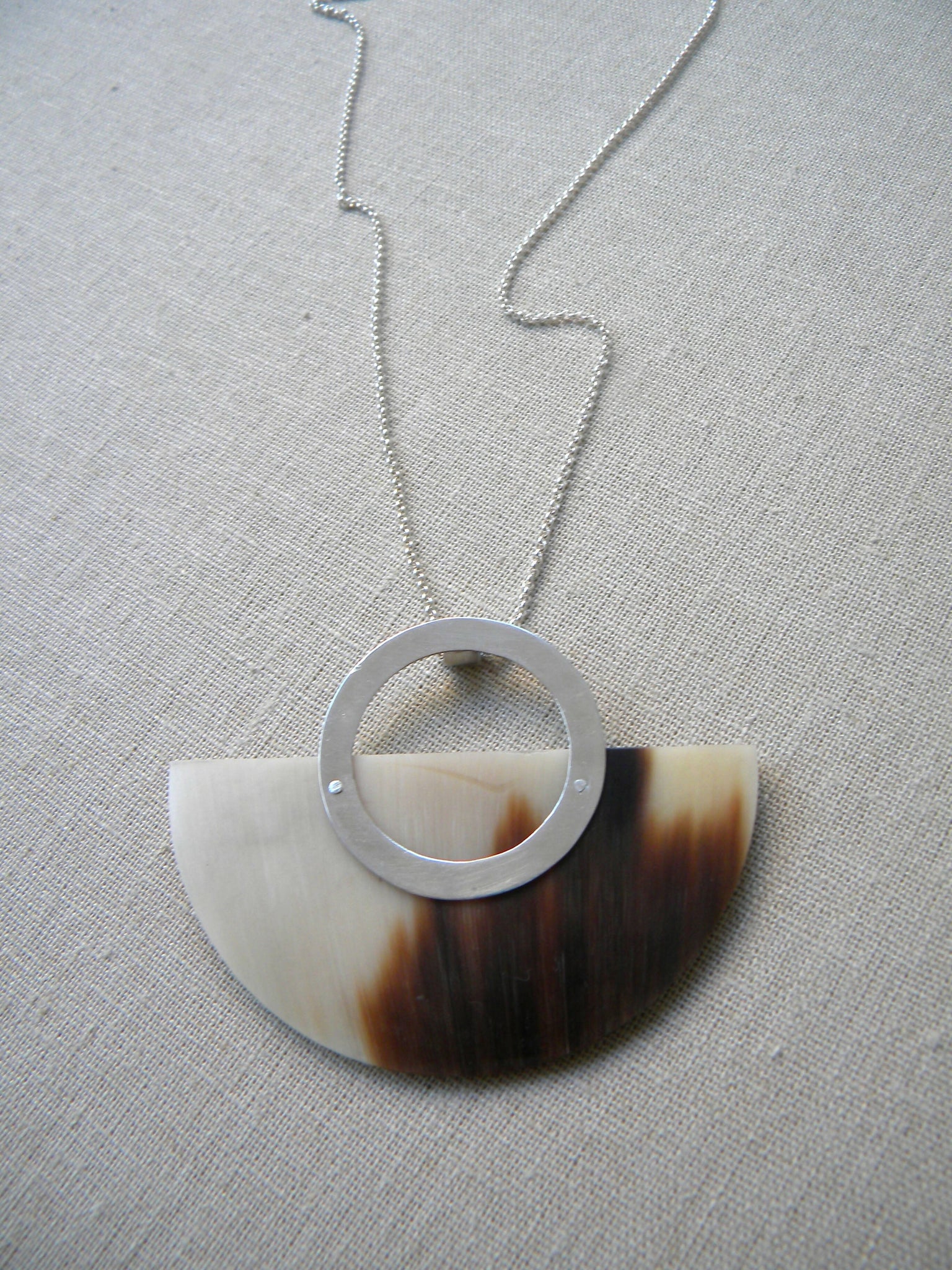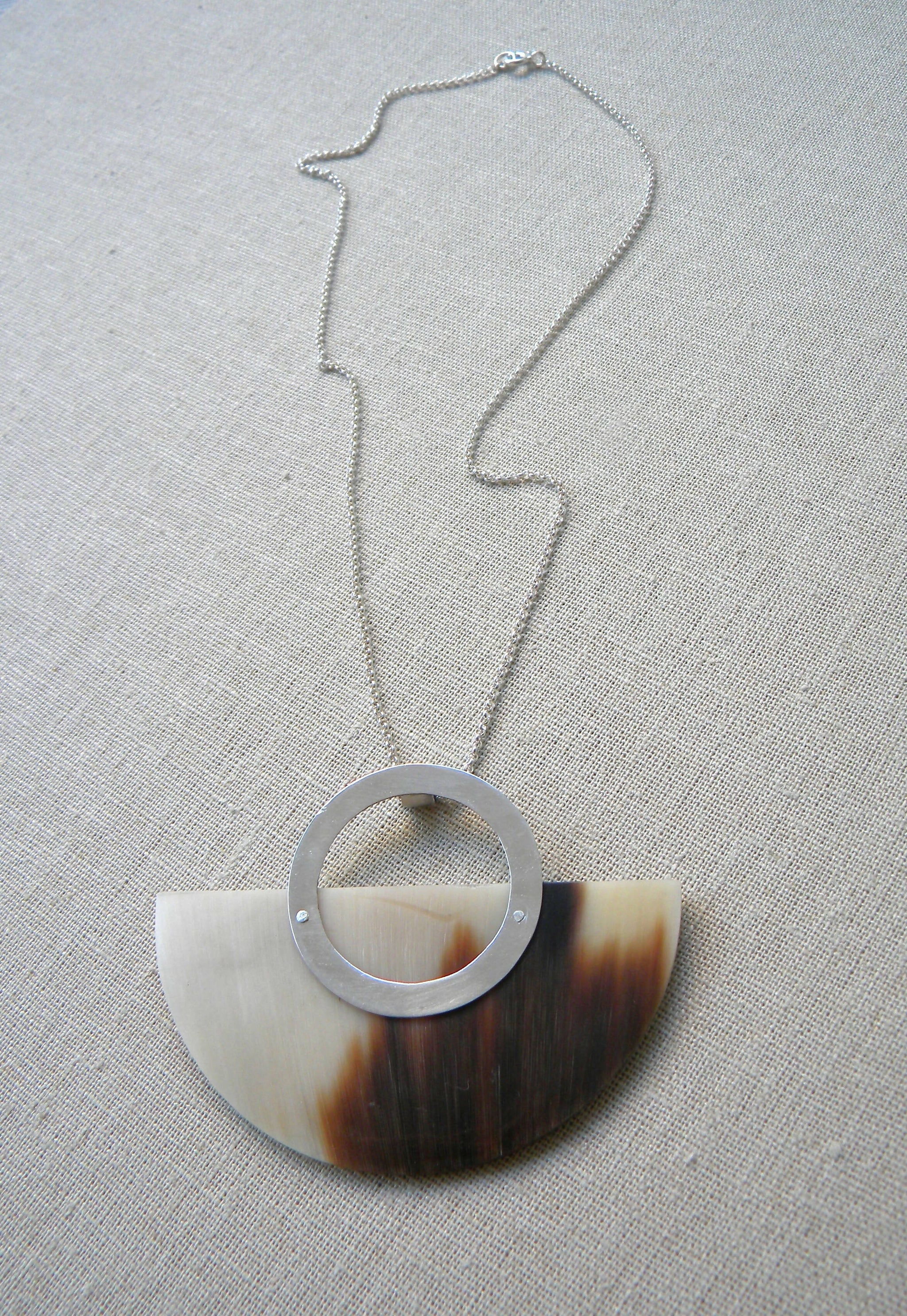 Collar corto con argolla de plata 950 de 3,5cm con un medio círculo grande de cuerno de vaca jaspeado beige, café y chocolate de 7cm de ancho y 3,5cm de alto. Tiene una cadena de plata con broche.