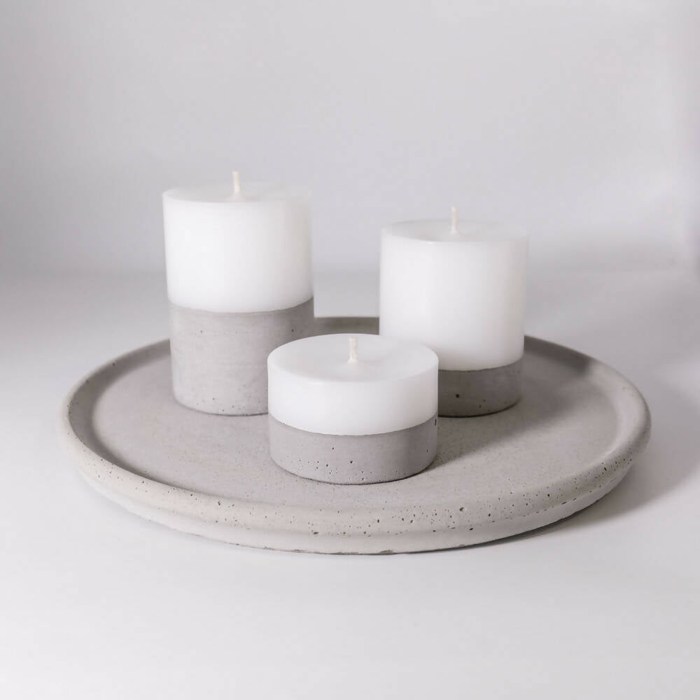 Conjunto de velas con base de Hormigón Natural en bandeja de hormigón natural. Productos 100% hechos a mano en Chile, súper decorativos y de muy buena calidad, los fabricamos con los mejores materiales para lograrlo. Perfecto para hacer un lindo y original regalo, para la decoración de los diferentes espacios de tu hogar (jardín, terraza, mesa de centro, arrimo, etc...), o para lograr un momento acogedor con la rica luz de las velas.