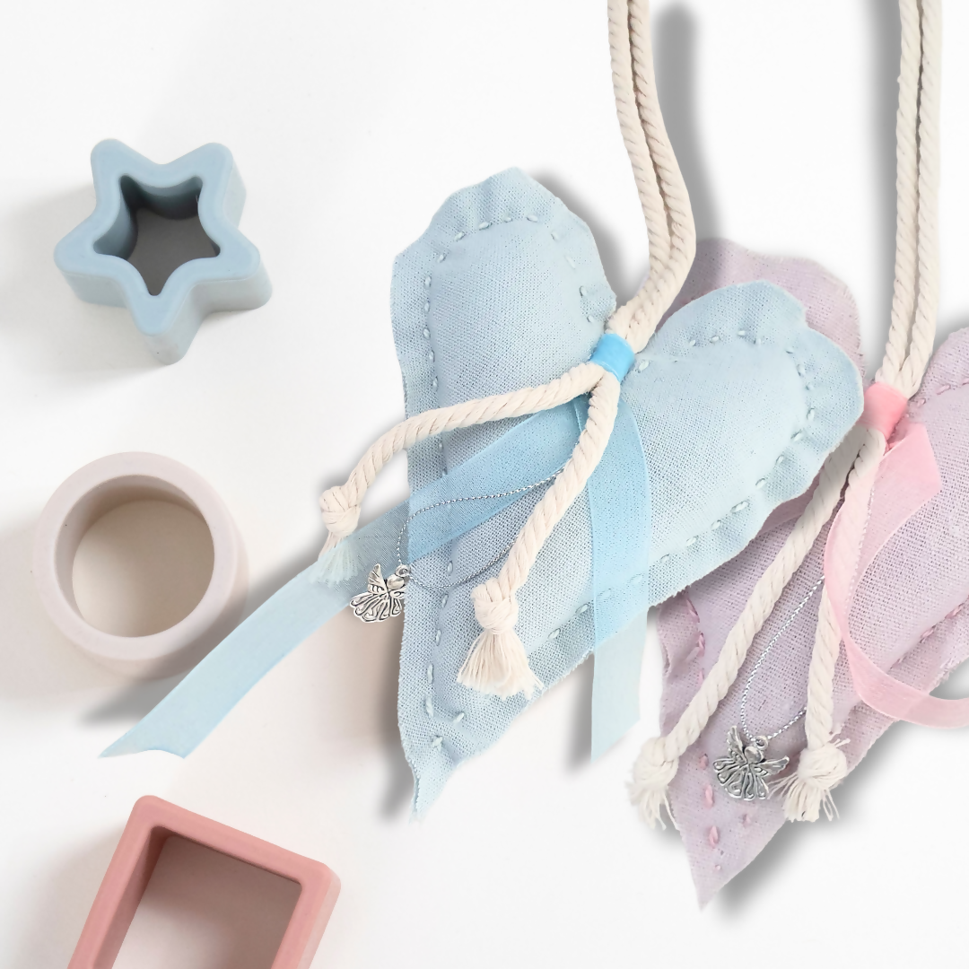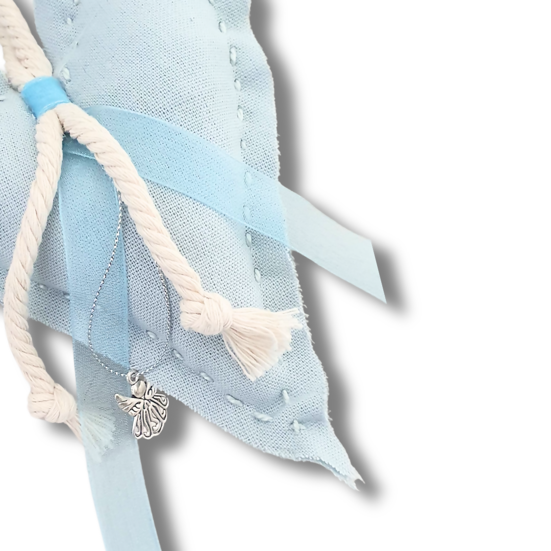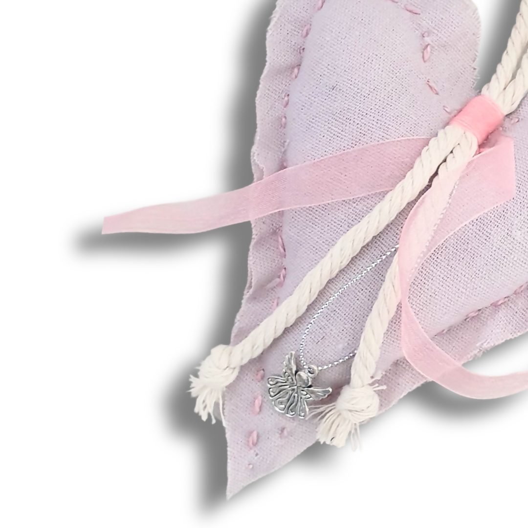 Cunero corazón de lino y algodón, con medalla protectora de ángel de la guarda, para colgar y decorar ese importante rincón de tus peques.