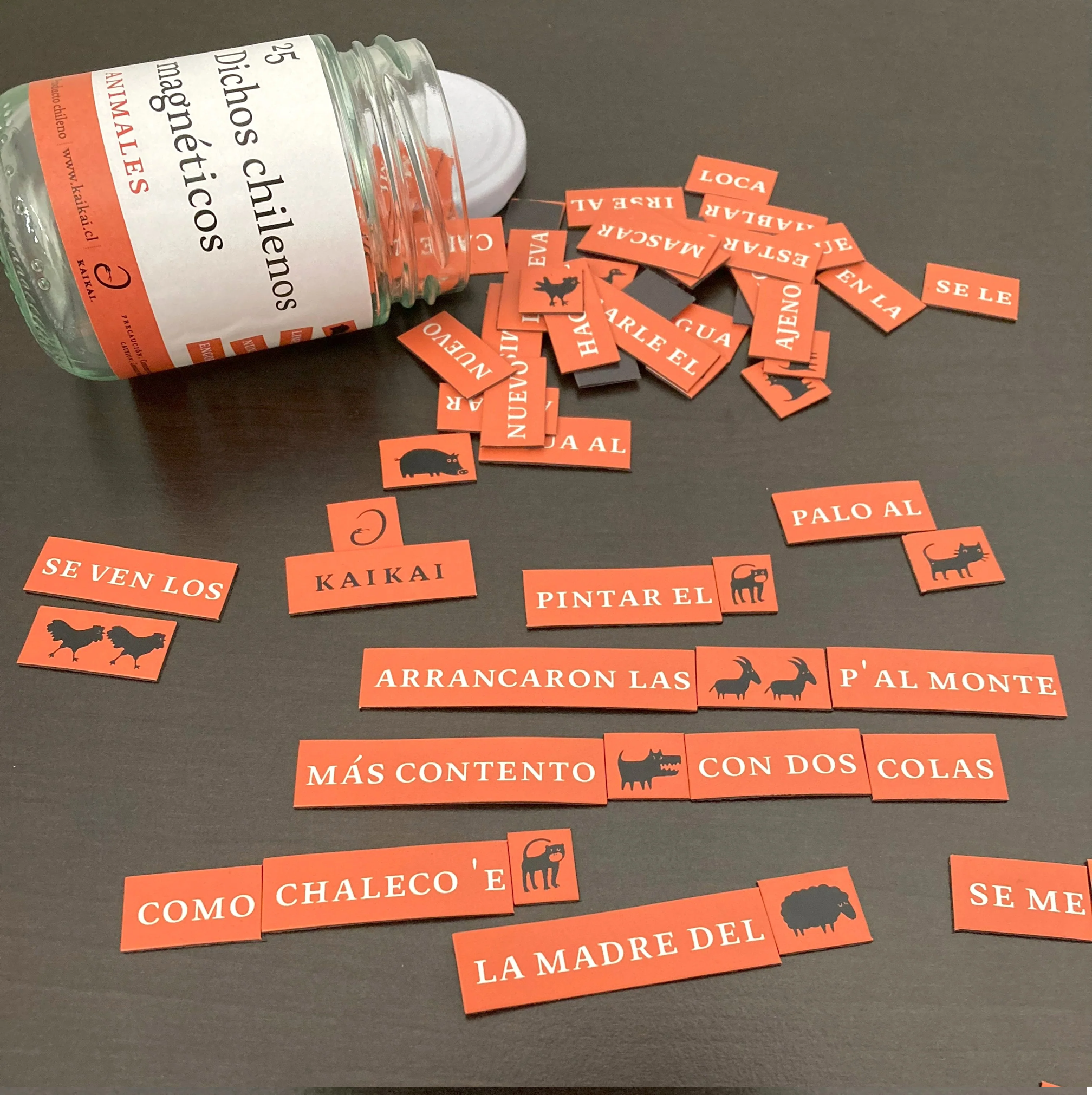 En Chile tenemos dichos para todo, y en muchísimos de ellos los protagonistas son los animales. Set de 25 dichos magnéticos ilustrados para armar en el refrigerador en cajita de cartón rígido.
