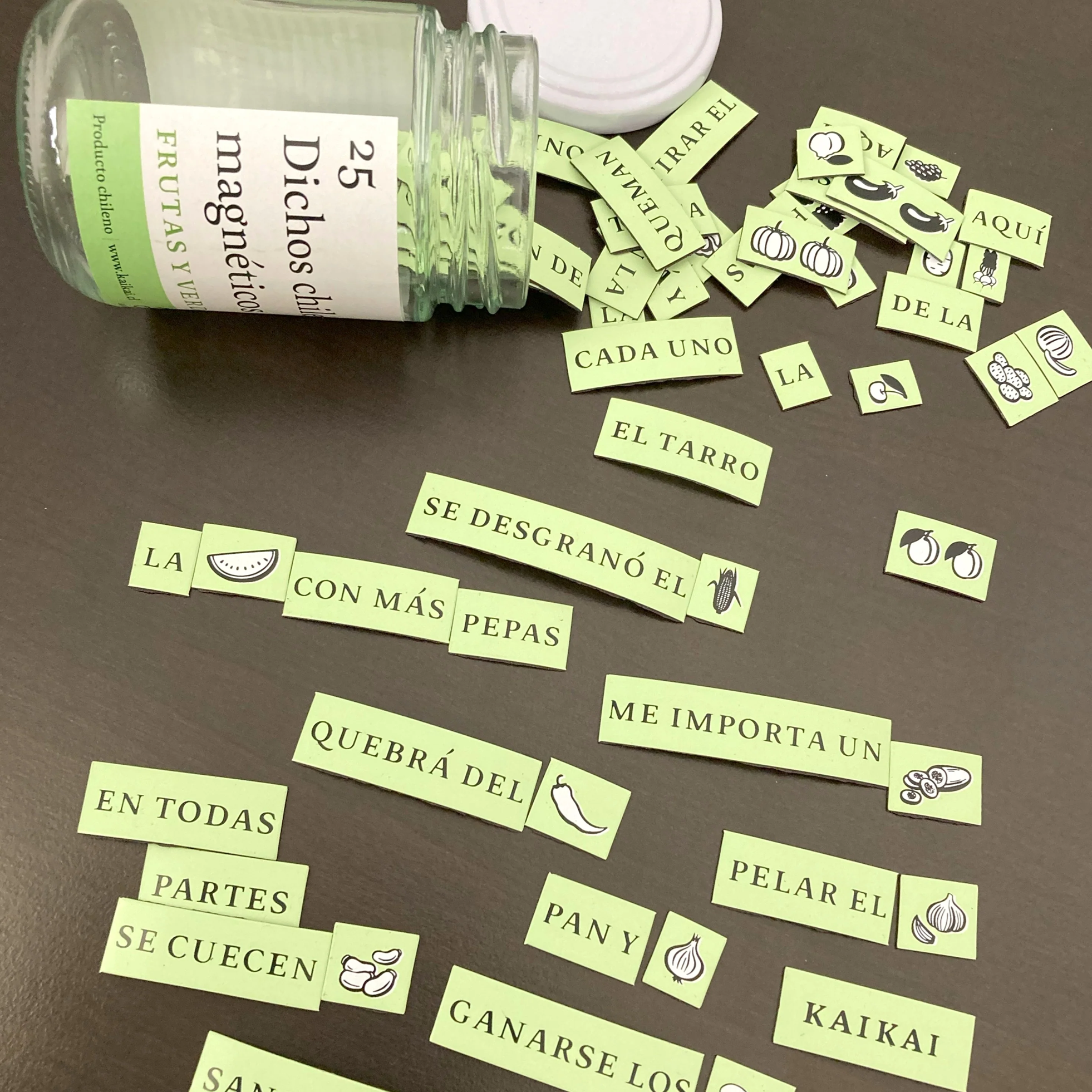 En Chile tenemos dichos para todo. Frutas y verduras son las protagonistas de muchos de ellos y aquí hicimos una selección. Set de 25 dichos magnéticos ilustrados para armar en el refrigerador en cajita de cartón rígido.