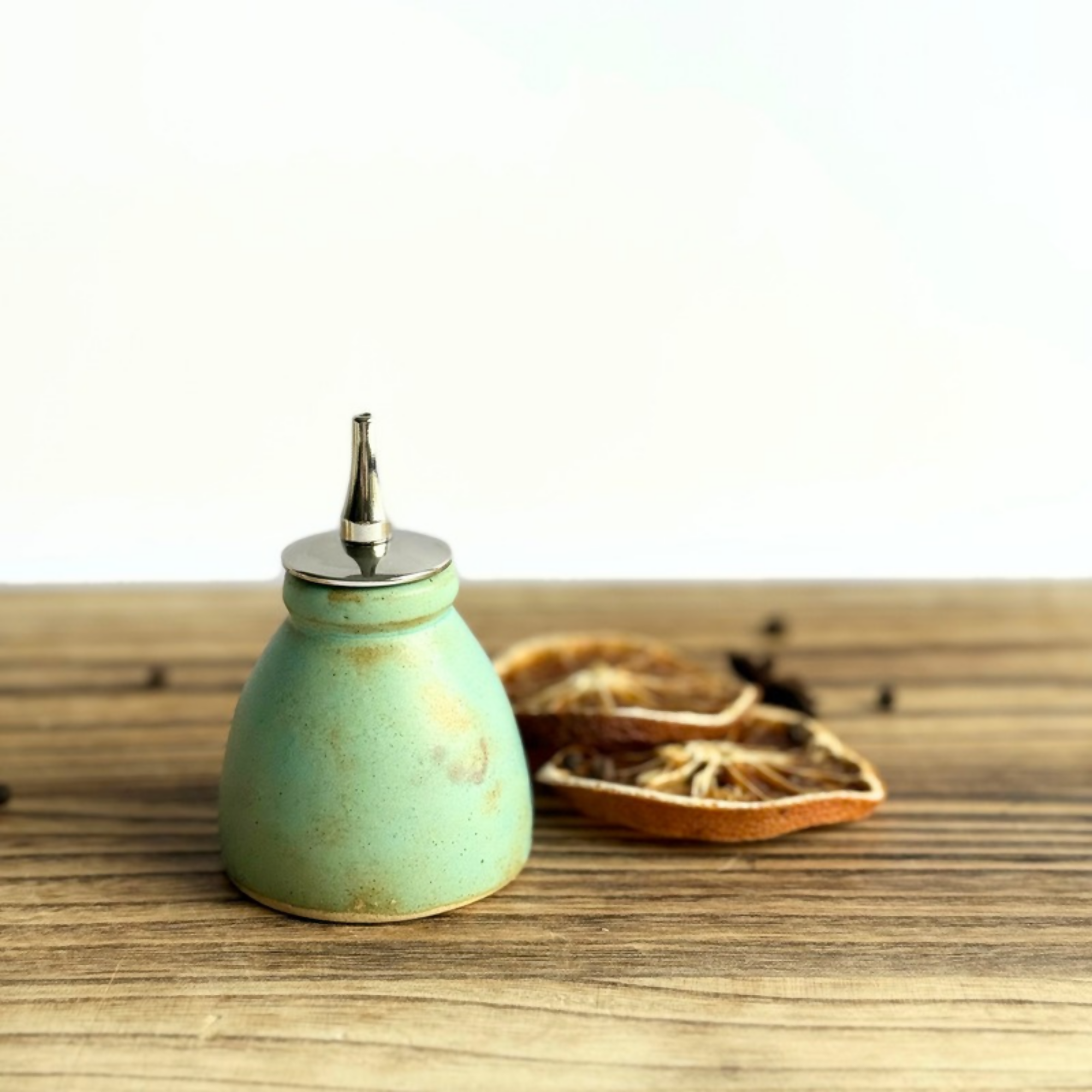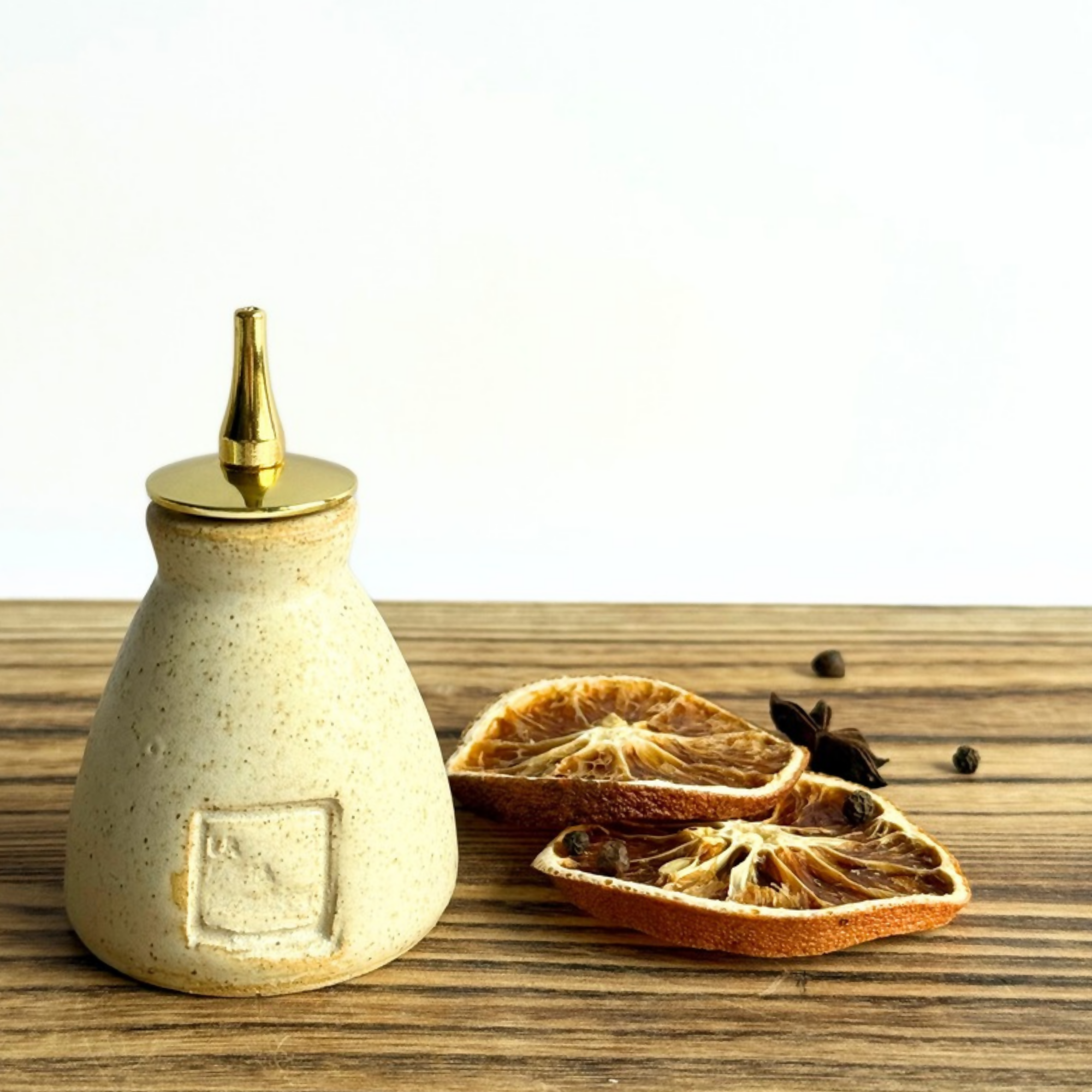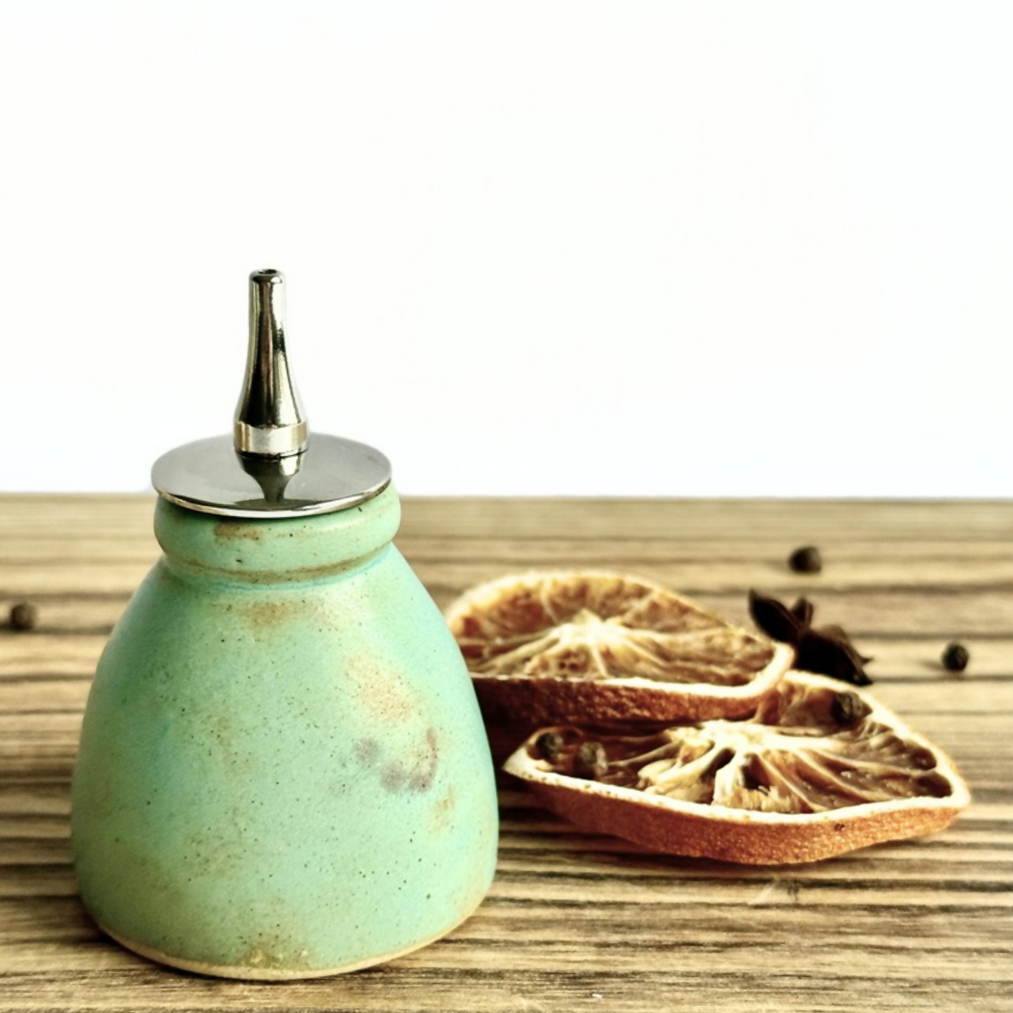 De cerámica gres con tapa metálica; una pieza elegante y funcional para dosificar con precisión el endulzante líquido.