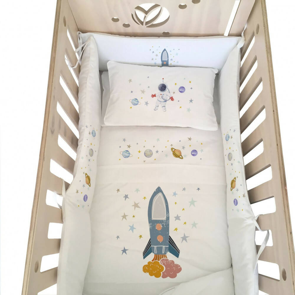 Cuna 140 x 70 cm. Incluye bajera elasticada, encimera y funda de almohada de 50 x 30 cm. Sábana superior 120 cm x 160 cm., sábana bajera 70 cm x140 cm x 15 cm.