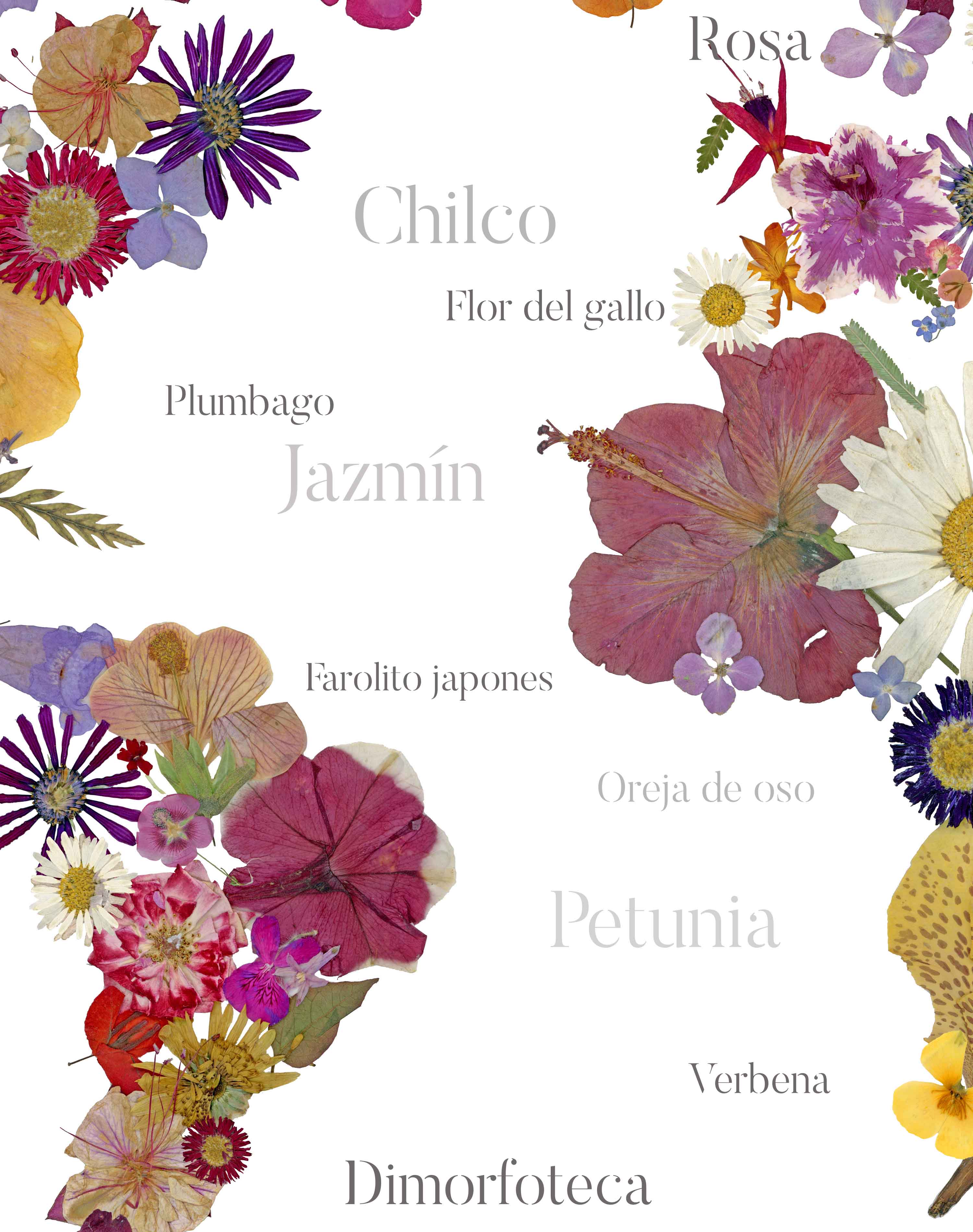 Rescatamos, recolectamos e identificamos cada una de las especies para posteriormente llevarlas al proceso de prensado, en donde buscamos mantener su color y forma para completar las composiciones de nuestros mapas florales, con flores propias de la flora Chilena