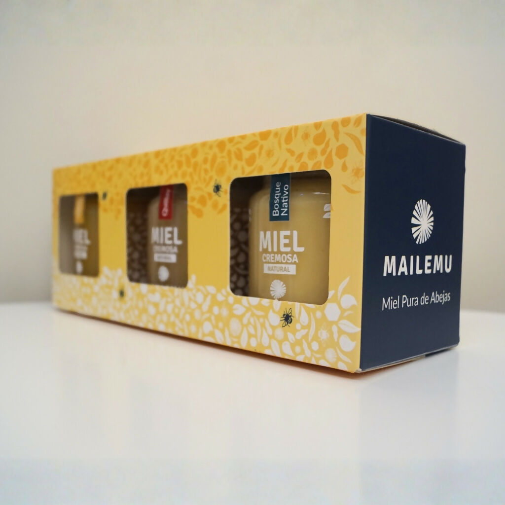 La historia detrás de este Pack Regalo Mailemu es simple: queríamos que regalar miel no fuera “un frasco más”, sino una experiencia completa. Por eso juntamos nuestras tres variedades en un formato perfecto para probar, comparar y compartir, manteniendo la calidad de siempre: miel 100% pura y en versión cremosa.
