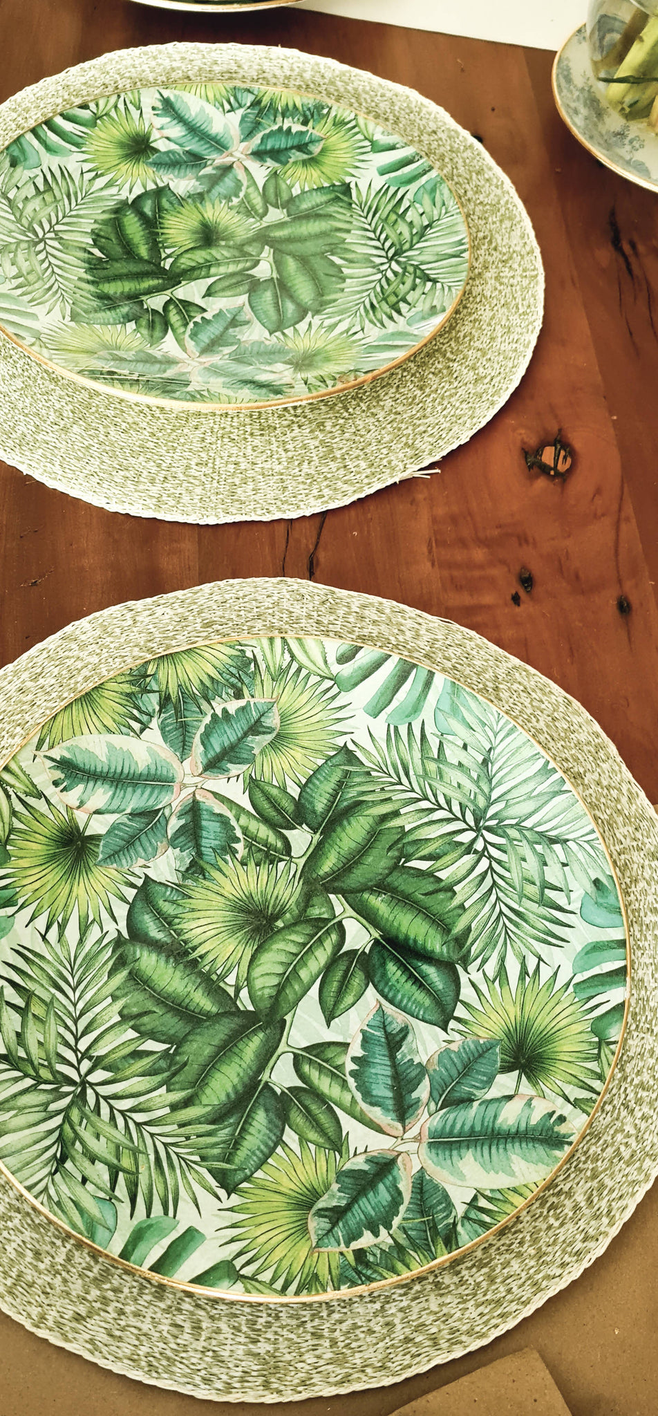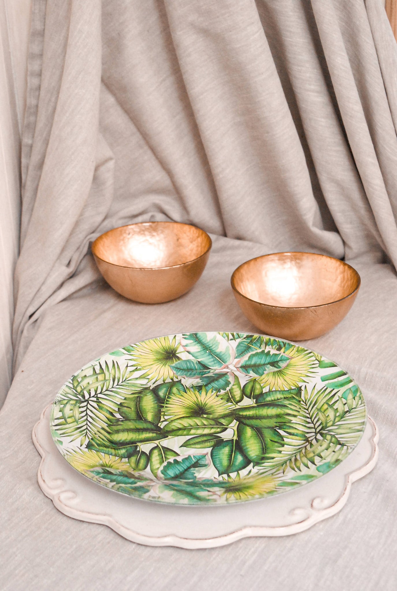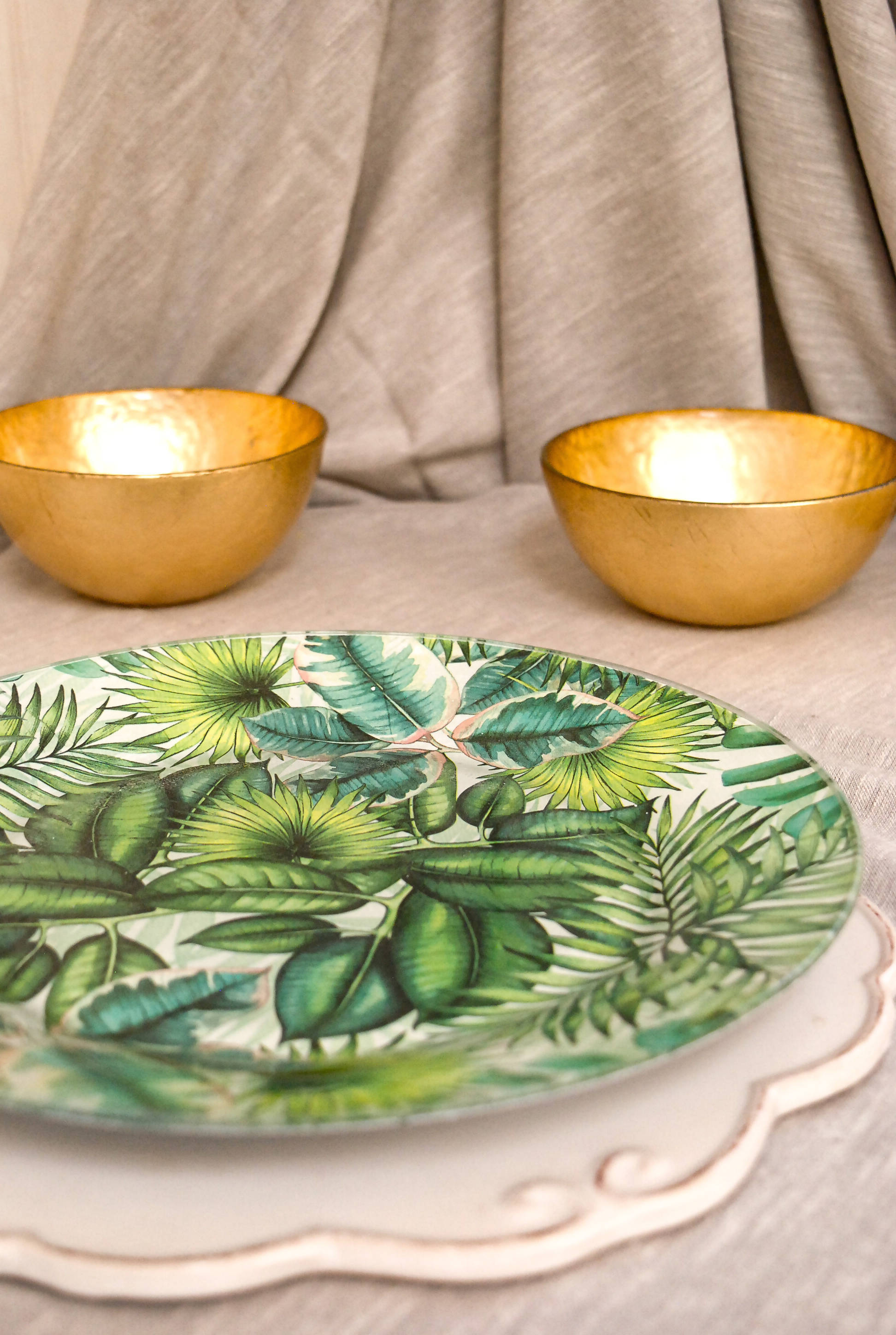 Plato redondo de vidrio templado de 25 cm, con tratamiento artesanal de decoupage. Apto para el lavado a mano y para el uso de comidas o elementos calientes sobre la superficie.