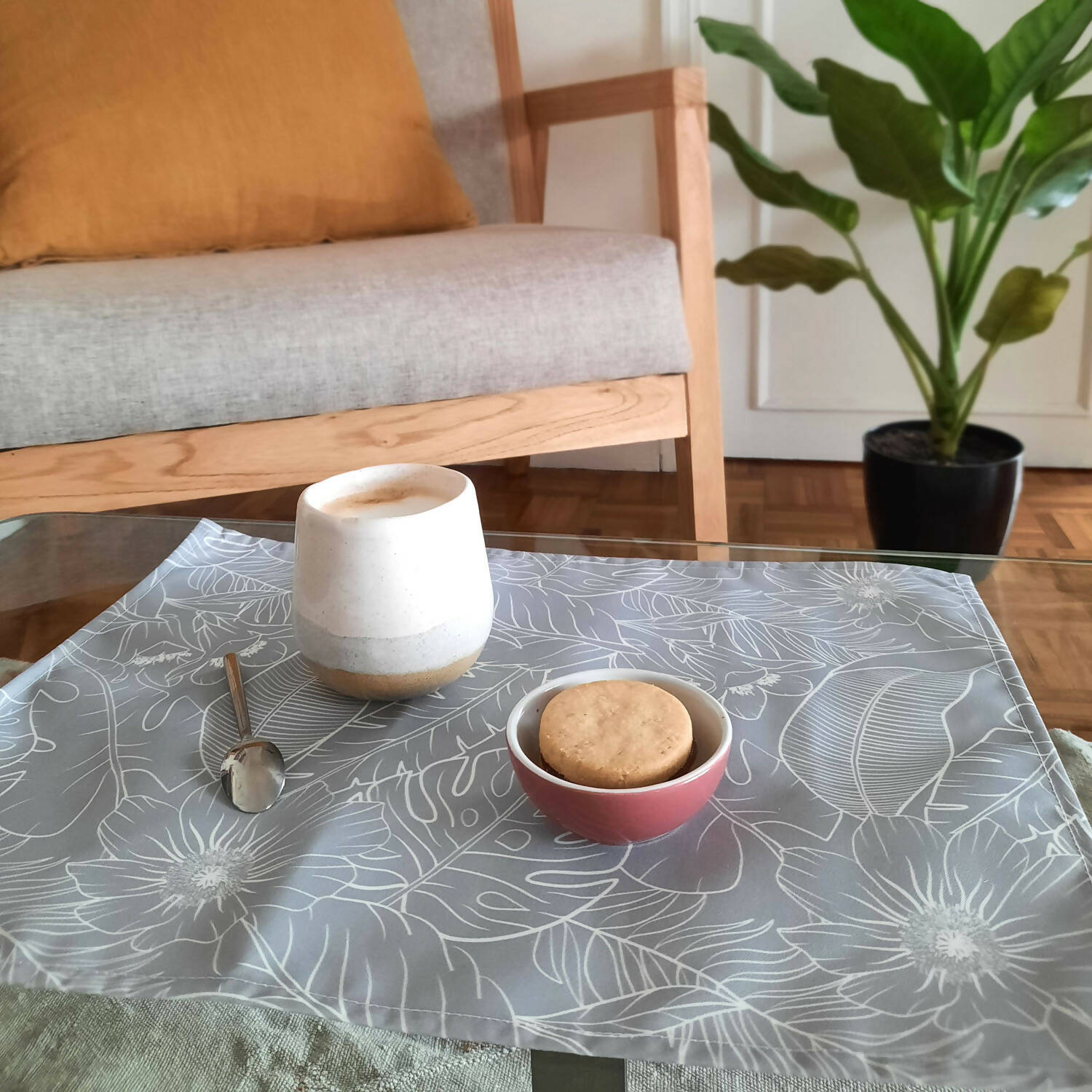 Set de 6 individuales rectangulares con diseño botánico gris fabricado con una tela con tratamiento anti manchas y repelente a líquidos.