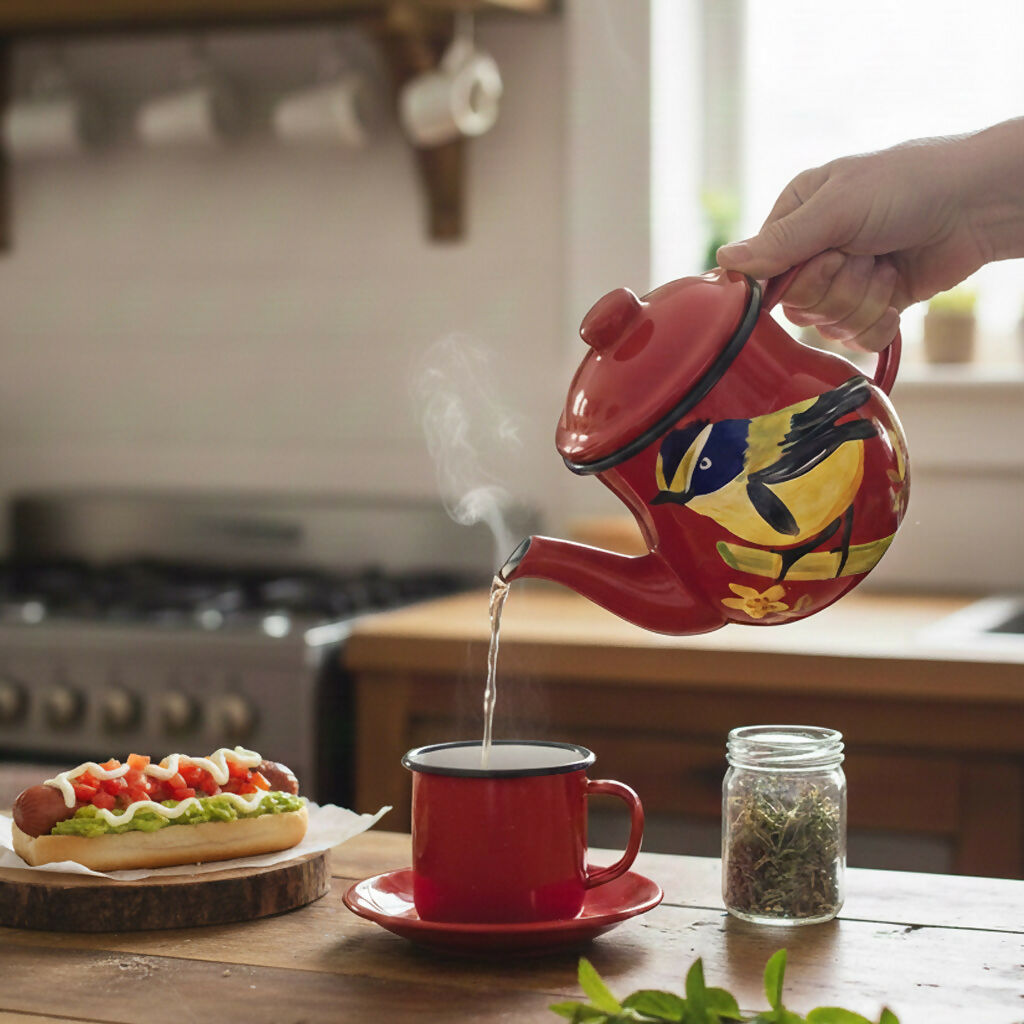 Descubre la esencia de Chile con esta tetera enlozada de 500 cc, un objeto único y artesanal con filtro enlozado incorporado. Su diseño, pintado a mano, está inspirado en la añañuca, una flor nativa de Chile que simboliza belleza y resistencia, y que se asocia con el misterioso mito de amor de la añañuca y el minero.