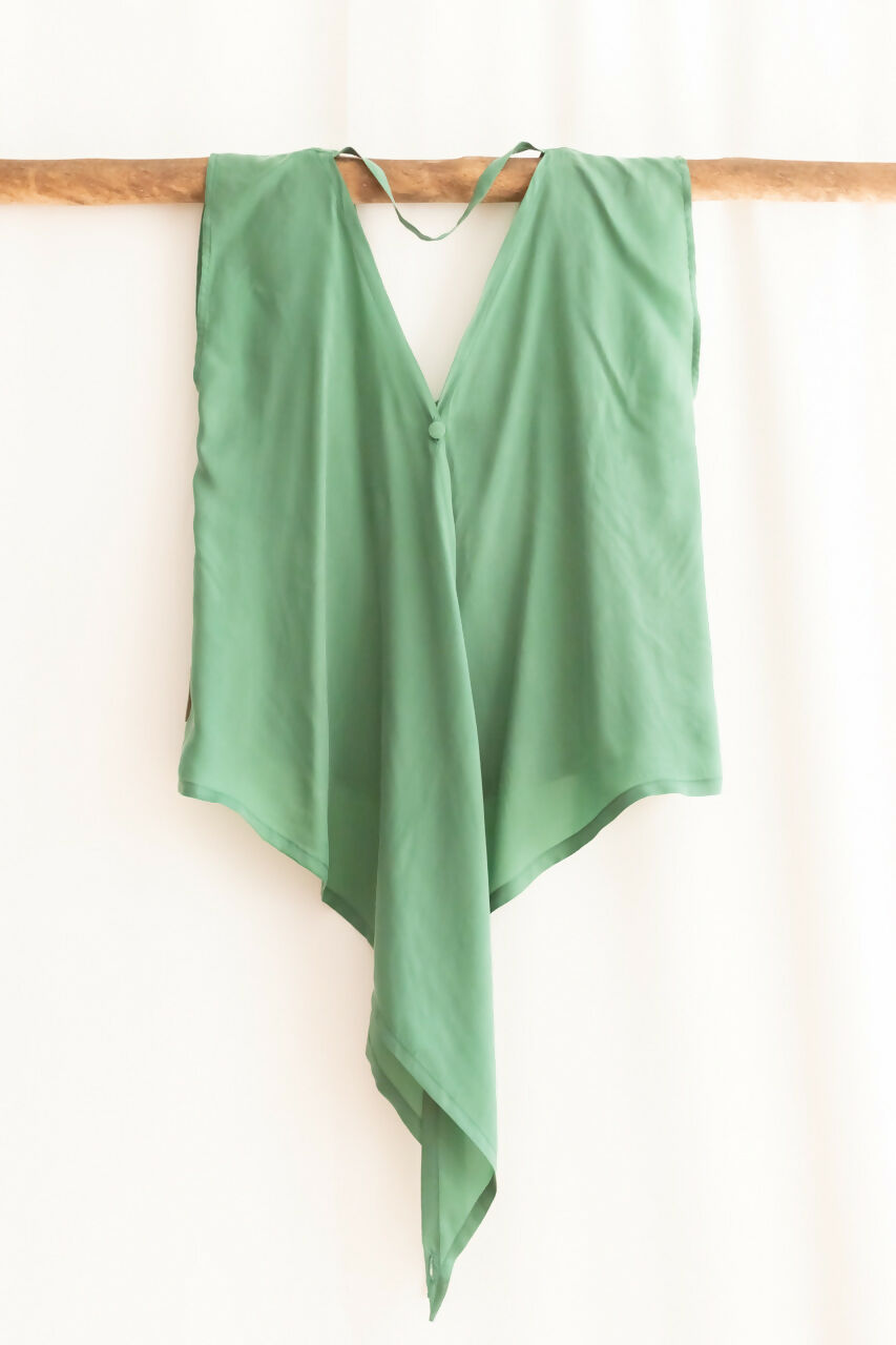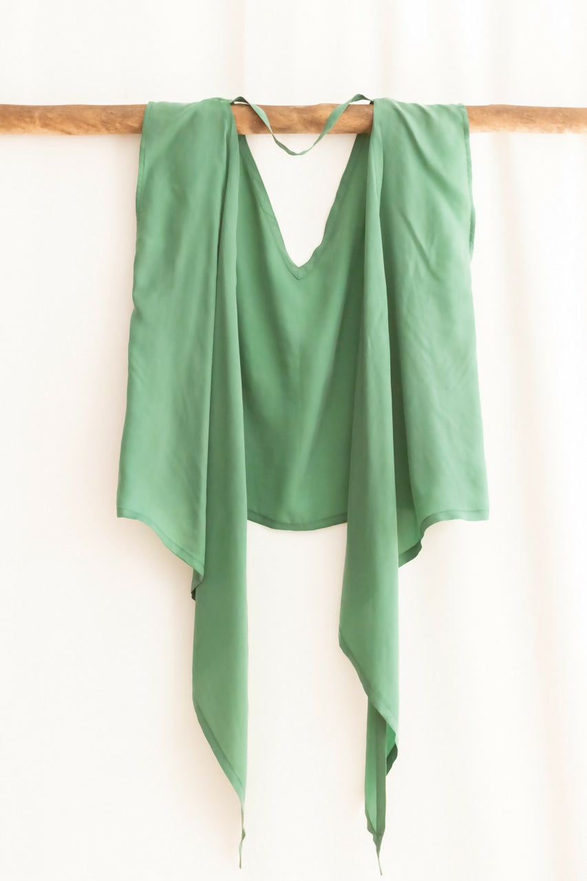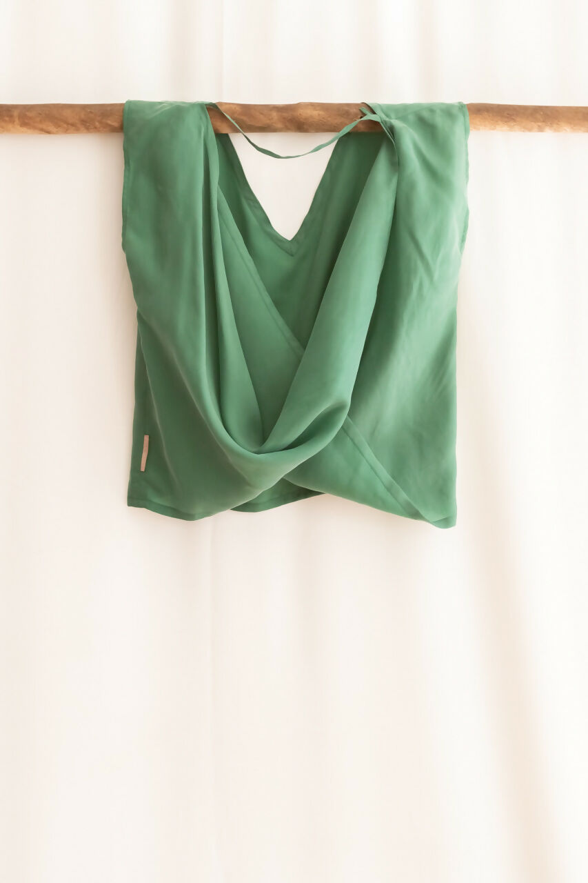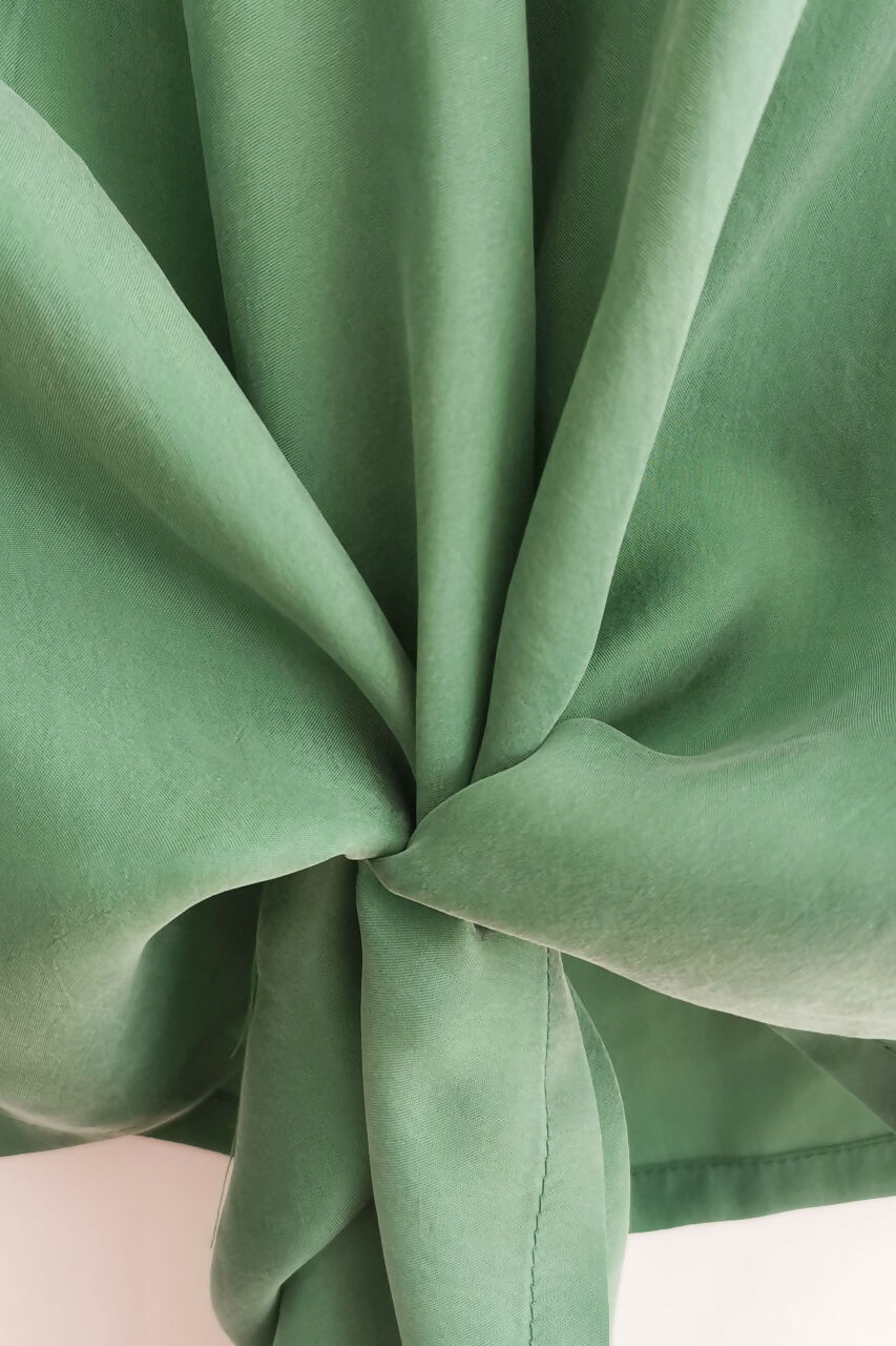 Está confeccionada en Cupro, que es un tejido que se obtiene al procesar excedentes de la producción del algodón. Es fresco y ayuda a regular la temperatura del cuerpo. Tiene una caída preciosa, no por nada le llaman la seda vegana. Es tan suave que no vas a querer sacártelo más!