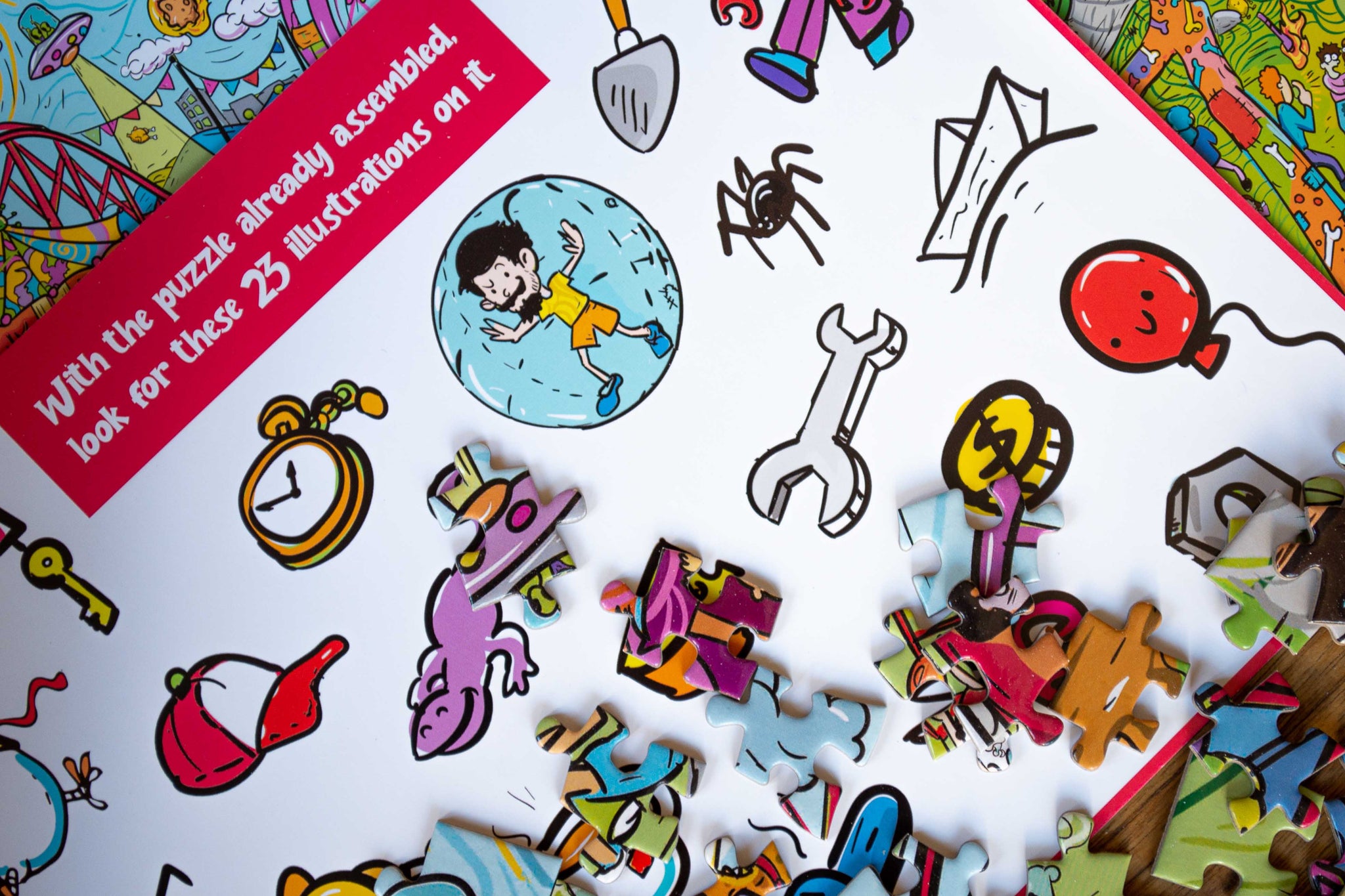 Puzzle 1.000 piezas de 50x70 cm / Ilustrado por Felipe Santis (@loco_santi) / Una vez armado, te invita a encontrar las 23 ilustraciones que se encuentran en él. / Incluye guía de armado y guía con ilustraciones para descubrir.
